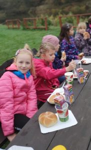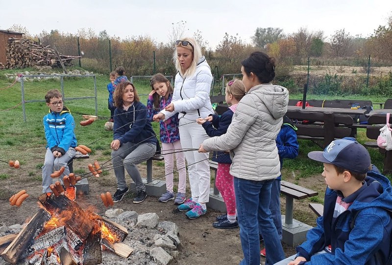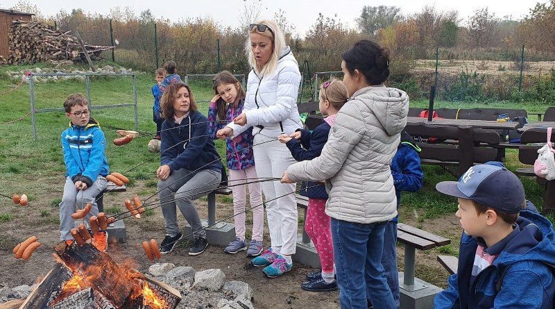 W dwóch rozpalonych ogniskach wspólnie z wychowawcami i rodzicami piekli kiełbaski oraz „pyry”. Dym z ogniska trochę „gryzł w oczy”, ale wszystkim dopisywał humor. Potem z dużym apetytem zjedli kiełbaski, pieczony chleb lub bułki i „pyry”.