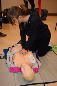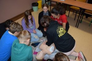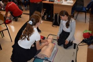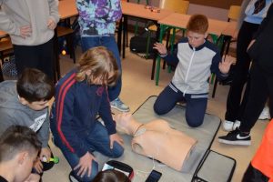 Każda klasa uczestniczyła w dwugodzinnym teoretycznym i praktycznym szkoleniu z wykorzystaniem najnowocześniejszego sprzętu – fantomów z czujnikami do pomiaru parametrów podczas prowadzenia resuscytacji krążeniowo – oddechowej – głębokości ucisków klatki piersiowej, ułożenia rąk, prędkości ucisków oraz AED – defibrylatorów szkoleniowych.