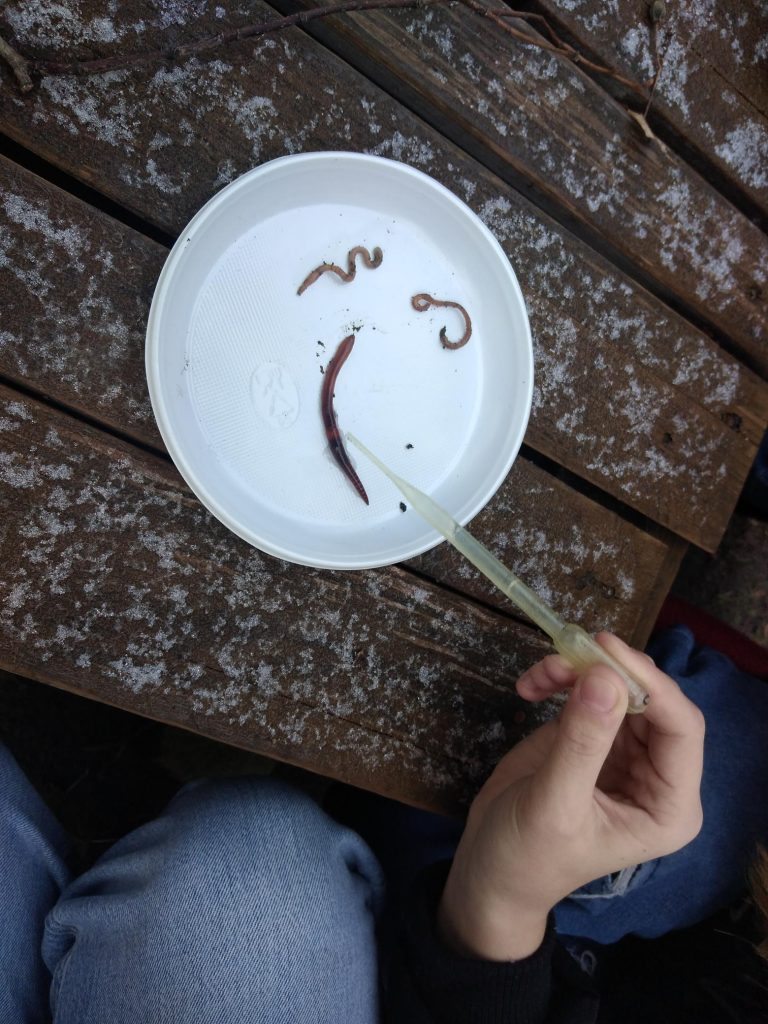 ➡️ Klasy VI – po deszczowej aurze wykopywały dżdżownice, które później obserwowały. 🔬🪱 Uczniowie analizowali ich budowę, lokalizowali siodełko i sprawdzali, jak reagują na kroplę wody. Po zakończonych zajęciach dżdżownice wróciły całe i zdrowe do gleby. 🌱🌧️