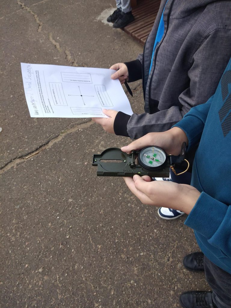 ➡️ Klasy IV– po opanowaniu teorii kierunków geograficznych, na terenie boiska szkolnego wyznaczały kierunek północny za pomocą kompasu i obserwacji przyrody. 🧭🌿