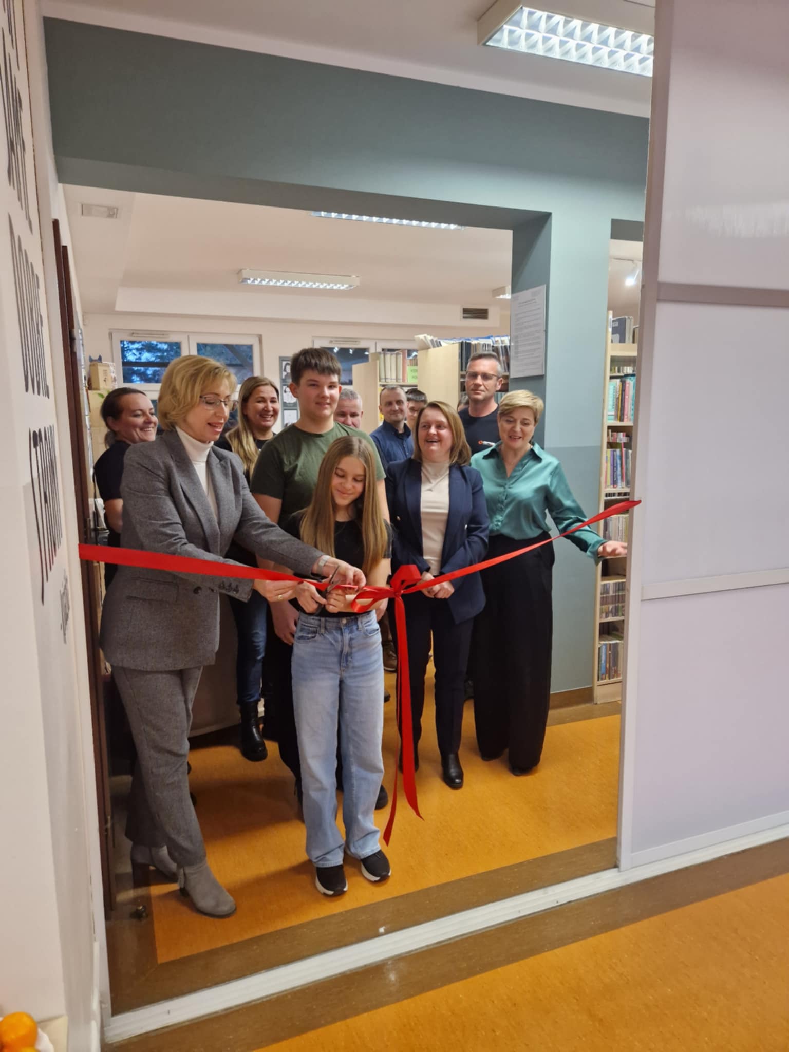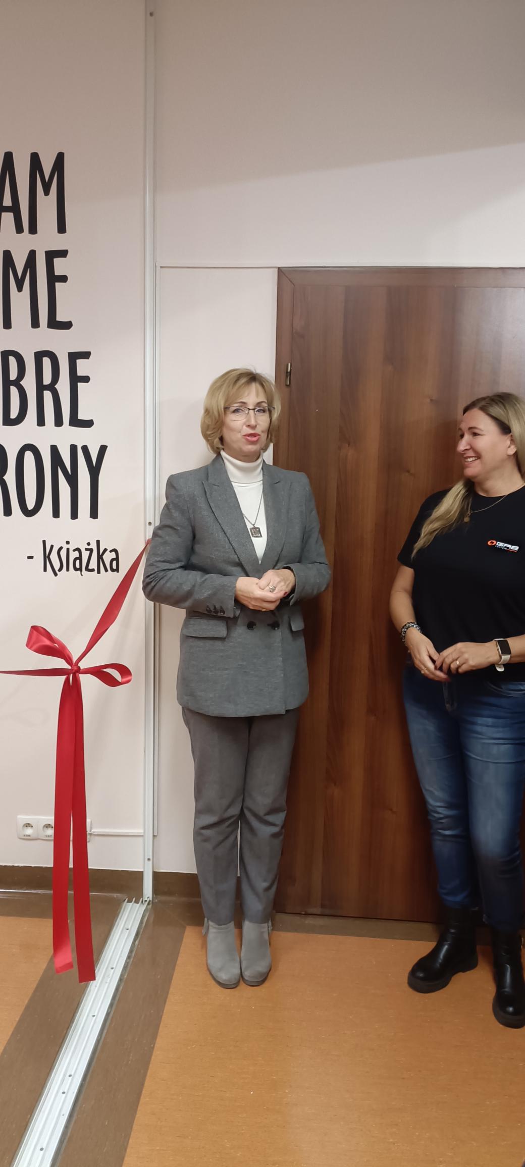 Symbolicznego przecięcia wstęgi i oficjalnego otwarcia dokonała Pani Dyrektor wspólnie z Przewodniczącą Samorządu Uczniowskiego