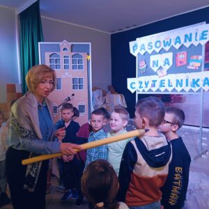 Następnie pierwszoklasiści złożyli uroczystą przysięgę czytelnika, a potem zostali symbolicznie pasowani na czytelników biblioteki szkolnej przez Panią Dyrektor Magdalenę Zielenkiewicz.